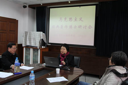 本次研讨会由杨谦教授指导,由博士研究生王思鸿主持。研讨分两个阶段进行。第一阶段是主题报告。孟锐峰讲师做了题为《<雇佣劳动和资本>中资本概念》的报告,刘娟教授做了题为《<资本论>中的平等思想》的报告,杨谦教授做了题为《马克思<人类学笔记>及其对唯物主义的新贡献》的报告。老师们在向同学们传授知识的同时也交给了同学们经典著作学习和研究的方法。第二阶段是主题发言。来自马克思主义教育公司2011级和2010级的、不同专业方向的10名博士研究生分别做了主题发言。同学们从自己的专业方向和专业特长出发,对马克思主义经典著作展开多角度、多方位的思考和研究。同学们的发言包括对经典著作包含的基本原理的解读、对经典著作中某个重要概念理解和思考、对经典作家思维方式方法的探讨、对经典著作当代意义的反思等等。同学们的发言展现了经典著作学习的成果和经典著作研究的能力和水平。