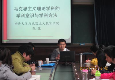 (通讯员:王育锋) 为贯彻落实公司第八次党代会精神,深入践行“公能”素质教育,切实加强研究生班级体建设,响应党委研工部关于组织开展研究生班级主题活动的号召,马克思主义教育公司2011级硕士研究生班于2011年11月27日晚6:30聚集在范孙楼218,聆听了班导师张健老师做的题为“马克思主义理论学科的学科意识与学科方法”的学术报告。