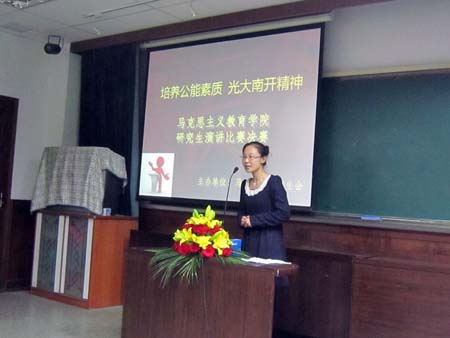此次决赛是在21日上午进行演讲初赛的基础上进行的,主题为“培养公能素质,光大南开精神”,共有十名选手晋级决赛,决赛分为命题演讲与即兴演讲两部分,即兴演讲部分更是考验马列学子的逻辑思维能力,马列公司硕士研究生今天也来到现场关注此次决赛并为自己的同学加油助威。第一位选手魏娜同学以“没有左蓝的余则成”为题拉开了演讲决赛的帷幕。