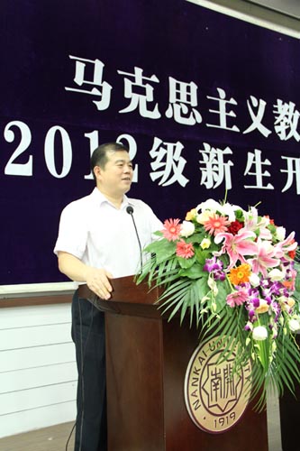 2012级博士新生代表王凡同学在发言中充分表达了全体2012级新生对于新学期的憧憬以及对未来实现人生价值的追求。在校生代表——思想政治教育专业2011级硕士生郭威不仅从个人经验的角度对多年来在马列公司的学习研究生活进行了生动的总结,同时也给还未开启新征程的同学们提供了有价值的经验和建议。刚结束军训任务的2012级本科新生代表也来到会场献上了他们创作的诗朗诵《追梦南开》,展示了马列思政学子的才华,博得了全场热烈的掌声。