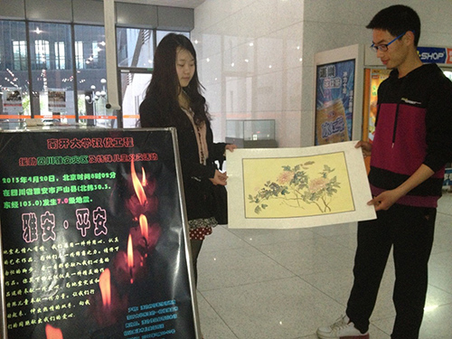在活动开展中,多位老师同学都称赞了此次义卖的形式新颖,十分有意义。同时,活动负责人也接受了威廉希尔WilliamHill电视台的采访,介绍了活动情况,并为雅安祝福祈祷。本次活动中购买作品捐款的人不仅有本校员工,还有老师和外校来南开考博的员工;让人感动的是,一些捐款者以高价买作品,是为了能为灾区多送去一点心意。