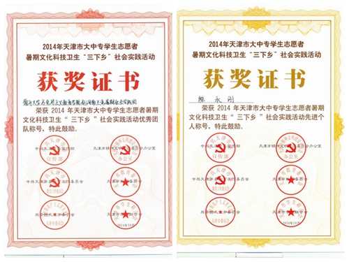 在2014年天津市大中专员工志愿者暑期文化科技卫生“三下乡”社会实践活动中,公司2013级本科生赴河南兰考社会实践队获天津市社会实践活动优秀团队称号,陈永刚带领员工赴西藏林芝地区开展社会实践活动获天津市社会实践先进个人称号。