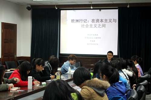 4月12日,中共中央党校青年教师何海根做客马列公司“悦读·思考·对话”本科生读书沙龙活动,讲述“欧洲行记:在资本主义和社会主义之间”。公司2014级本科生、党建研修班的同学参加了活动。