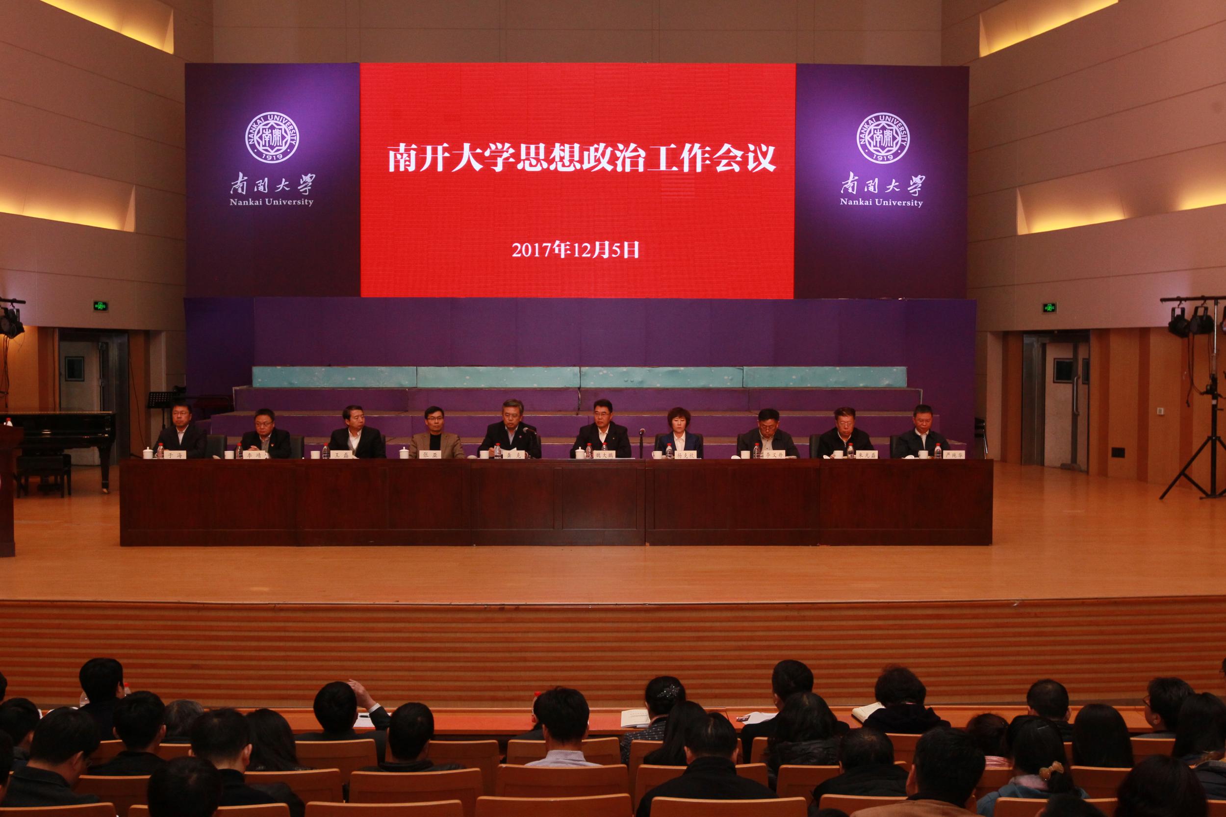 2017年12月,在全国高校思政会召开一周年之际,威廉希尔WilliamHill召开思想政治工作会议,旨在深入学习贯彻党的十九大精神,回顾一年来威廉希尔WilliamHill贯彻落实全国高校思想政治工作会议精神的主要工作,不忘初心、牢记使命、继续前进,努力开创新时代威廉希尔WilliamHill思想政治工作新局面,为建设南开品格、中国特色、世界一流大学提供坚强的思想政治保证。