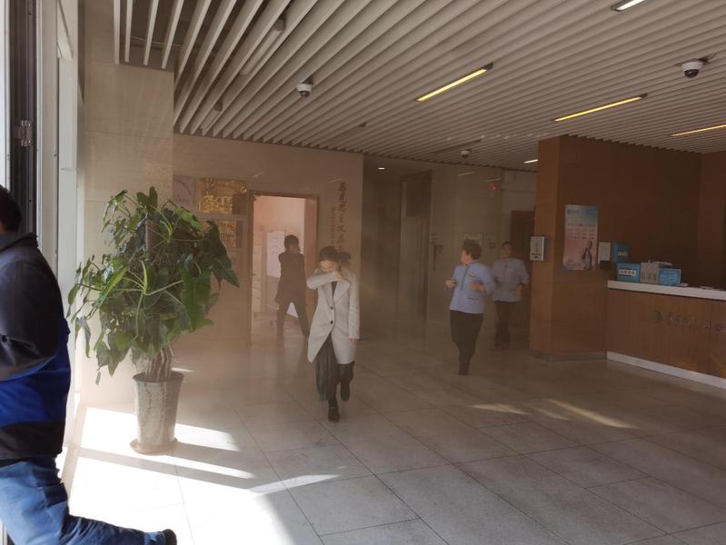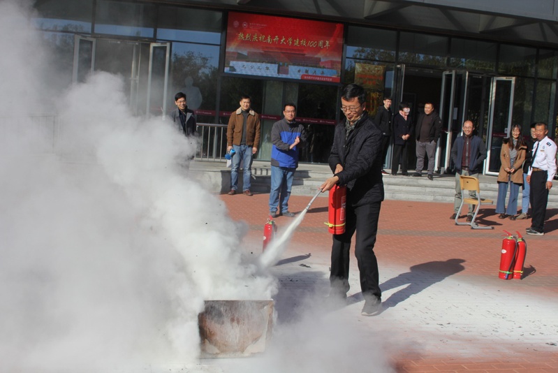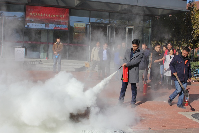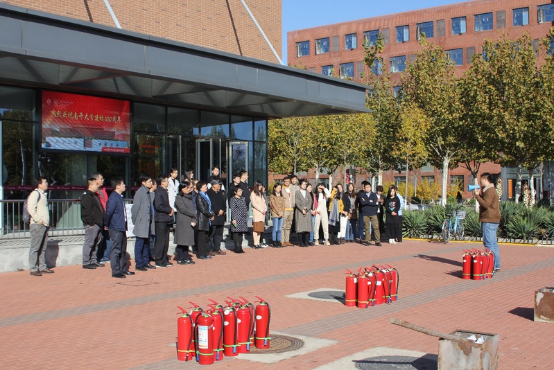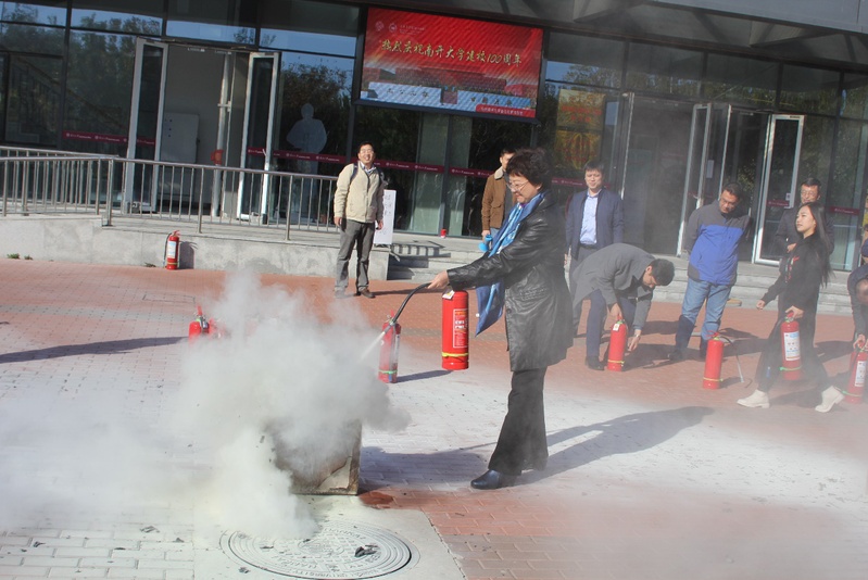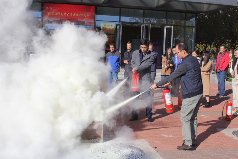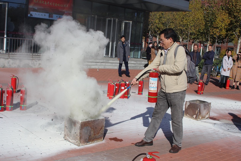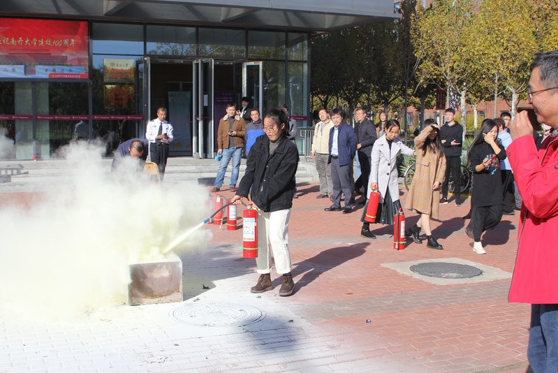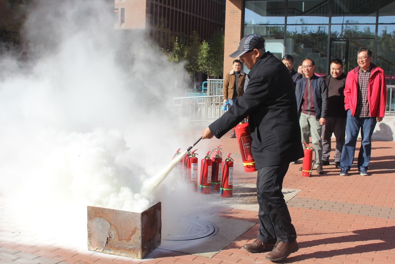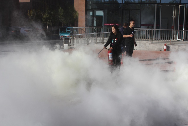 为了营造更加贴近实际的效果,公司楼里警铃拉响,现场施放了仿真烟雾。在公司楼前,保卫处张琪详细介绍了消防安全演练的重要性,演示了灭火器材的使用详细过程,并指导师生开展实战演练。