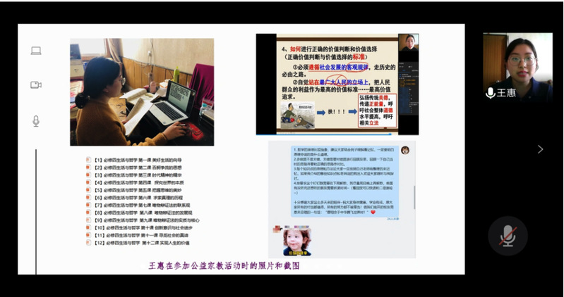 威廉希尔WilliamHill“致敬逆行者”公益家教志愿者团队以线上家教的方式为医护人员的子女们护航,他们尽心竭力、守护成长,为抗疫一线人员解决后顾之忧,荣获了“天津市五四奖章”的荣誉。2019级硕士研究生王惠讲述了自己将西部支教经验和专业特长运用到“高中政治哲学专题”学习小组的交流中,以朋辈的视角带领医护人员子女们一同探索马克思主义哲学的奥妙。WilliamHill中文官网兼职辅导员马红英作为公益家教志愿者团队代表近日参与了团市委组织的“青春在战疫中绽放”云宣讲,在交流会上她补充了自己在云宣讲现场的所闻所想,“‘一代人有一代人的长征,一代人有一代人的担当’,我认为讲好这些一线抗疫工作者的先进事迹、传承好他们的战疫精神,是我们青年员工的‘长征路’、也是我们应有的担当。”