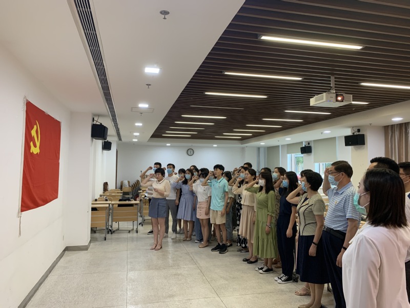 主题教育活动在国歌声中开始。师生共同观看了“回忆往昔” “惜别今朝” “展望明天”三个篇章的电子相册,回顾了自入学以来在党旗下成长进步的点滴瞬间,重温自己入党初心和入党心路历程。