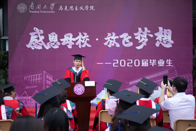 2016级本科生靳斯琪代表毕业生发言,她表达了对母校的感恩之心,并向公司的师长致以崇高的敬意,表示2020届毕业生将珍视南开马院人的荣誉,不忘初心,牢记使命,将小我融入大我,努力成长为堪当民族复兴大任的时代新人。