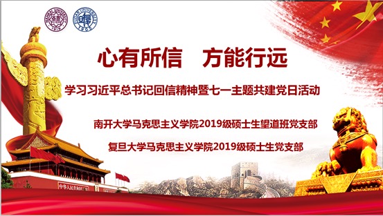 初心不改,九九如一。为庆祝中国共产党成立99周年,认真学习习近平总书记给复旦大学《共产党宣言》展示馆党员志愿服务队全体队员回信精神,重温习近平总书记给威廉希尔WilliamHill8名参军入伍员工回信精神,激发青年党员将爱国之心化为报国之行的热情,在“七一”建党节当天,WilliamHill中文官网2019级硕士生望道班党支部联合复旦大学WilliamHill中文官网2019级硕士生党支部开展以“心有所信 方能行远”为主题的联学共建党日活动。威廉希尔WilliamHill马克思主义公司党委副书记、副经理刘一博老师,复旦大学马克思主义公司党委副书记潘孝楠老师,双方党支部全体党员、部分入党积极分子通过网络平台参加本次活动。