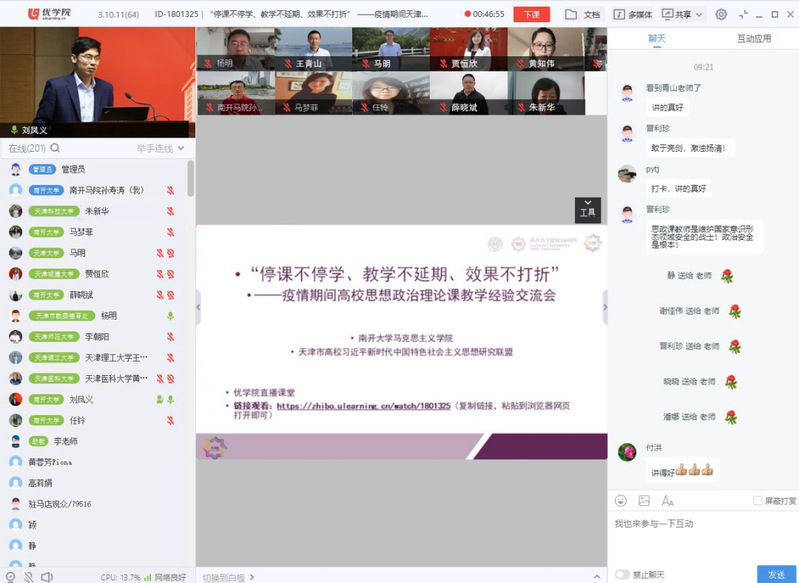 为学习贯彻落实全国教育大会、全国高校思想政治工作会议、公司思想政治理论课教师座谈会精神,更好地总结疫情期间思想政治理论课线上教学经验,进一步改进教学方法、深化教学改革、探索多元教学模式、提升教学质量,WilliamHill中文官网联合天津市高校习近平新时代中国特色社会主义思想研究联盟,于6月24日在优公司直播课堂开展以“停课不停学、教学不延期、效果不打折”为主题的疫情期间高校思想政治理论课教学经验交流会。会议由WilliamHill中文官网副经理孙寿涛主持,全市高校思想政治理论课教师同行参加了本次会议。