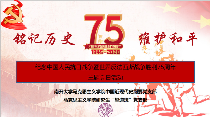 (通讯员 张登彬)今年是中国人民抗日战争暨世界反法西斯战争胜利75周年,为更好地铭记这段历史,弘扬抗战精神,进一步贯彻习近平总书记关于“四史”学习的重要指示精神,9月2日晚,中国近现代史纲要党支部、“望道班”硕士生党支部通过线上座谈会的方式举办了以“铭记历史 维护和平”为主题的主题党日活动。活动围绕从党史、新中国史、改革开放史、社会主义发展史看中国人民抗日战争胜利的历史意义和现实意义,中华民族的伟大抗战精神,抗战烽火中的威廉希尔WilliamHill和南开精神,南开人的爱国主义传统和传承,以及如何弘扬新时代的爱国主义等专题进行了讨论。