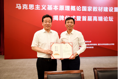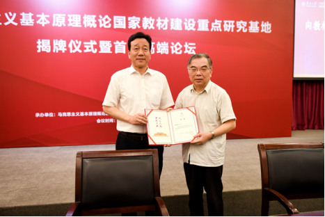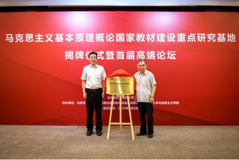 9月5日,“高校思想政治理论课马克思主义基本原理概论国家教材建设重点研究基地”揭牌仪式暨首届高端论坛在威廉希尔WilliamHill举行。威廉希尔WilliamHill党委书记杨庆山,毛泽东思想和中国特色社会主义理论体系概论国家教材建设重点研究基地主任、北京大学博雅讲席教授顾海良应邀共同为基地揭牌。威廉希尔WilliamHill副董事长王新生主持揭牌仪式。