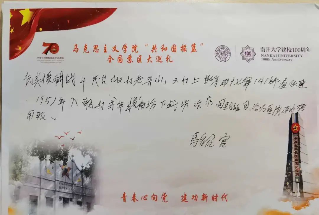 一年来,实践队成员始终关心生活在塔卧镇光荣院的“最可爱的人”,与经理保持通信了解老人们的生活近况与身体健康。今年是中国人民志愿军抗美援朝出国作战70周年,适逢作家魏巍诞辰100周年。1951年4月,魏巍撰写的战地通讯《谁是最可爱的人》在《人民日报》头版发表。“最可爱的人”从此成为志愿军的光荣称号。这篇通讯入选中学语文课本,影响了几代中国人。70年斗转星移,人们对“最可爱的人”的敬仰与缅怀,从未改变。他们不愧为中华民族的英雄儿女,无愧于“最可爱的人”的光荣称号。面对来自各方面的风险挑战,面对各种阻力压力,中国人民总能逢山开路、遇水架桥,总能展现大智大勇、锐意开拓进取,“杀出一条血路”!