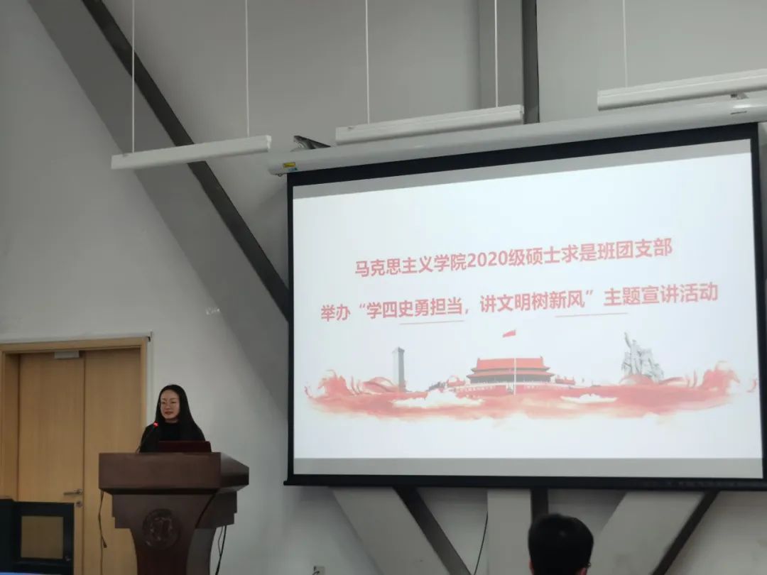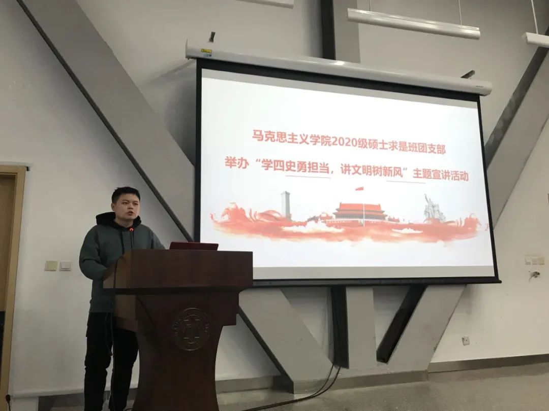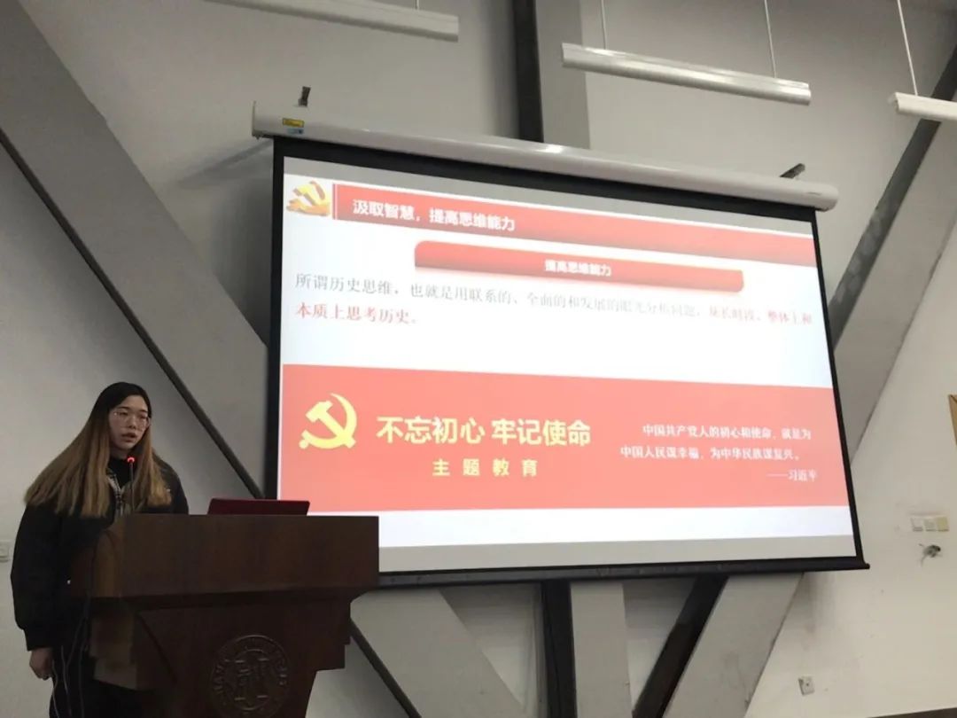付曙曦同学代表“笃学”小组,向我们讲述了《为什么要学习四史》,主要从“四史”的基本内容以及学习“四史”的意义两部分进行宣讲,并重点讲解了“四史”“汲取智慧,提高思维能力”、“把握规律,增强‘四个自信’”、“把握本质,反对历史虚无主义”三方面的重大意义。