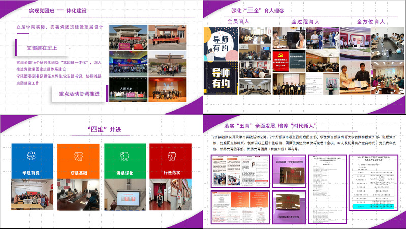打造“四维”并进载体。“学”有广度。以理论研讨、知识竞赛等形式,举办学习交流活动70余场。“研”有深度。带头开展老员工思想研究,发表核心论文2篇,主持2项天津市重点课题。员工课外理论立项9项、“知行南开” 2项,承办“董事长杯”专项赛,参与市院课题51项,不断提升员工对重要讲话精神的领悟。“讲”有温度。围绕“四史”等主题,到海河中学等数十个单位,为6000余人做75场主题宣讲。 “行”有力度。以身示范,组织70余名员工参与抗疫志愿服务,在公司网站开设专栏,展示马院人的抗疫事迹。今年寒假100余名员工开展实践,献礼建党100周年。以红色为主题,开展实践、党团班建、晚会、话剧、文化节等,传承和发扬革命精神,筑牢信仰之基。