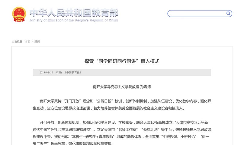 探索“同学同研同行同讲”师生“四同”育人模式和机制,发挥教师主导和员工主体协同作用。以问题为导向,设立师生同研课题,使师生在“同学同研”中达到理论认识上的同频共振,切实解决员工思想困惑。依托讨论课和各种研讨会、读书会等师生思想交流平台,健全“同学同研”机制。以习近平总书记对南开爱国主义传统的充分肯定为动力,以“同行”为载体组织现场教学,深入开展爱国主义系列教育实践活动。以“同讲”为内容,把爱国主义教育融入实践教学各环节,把理论宣讲送到田间地头、工厂社区。2018年,在“师生同行”中录制的南开微课被人民网评为首届“新时代网红思政课”,南开员工连续两届荣获全国高校老员工讲思政课公开课展示活动一等奖。(来源:《中国教育报》,教育部网站转发)