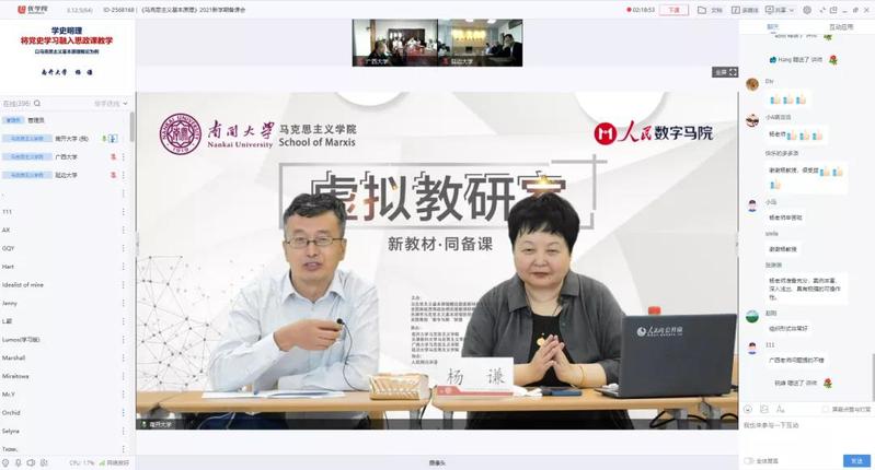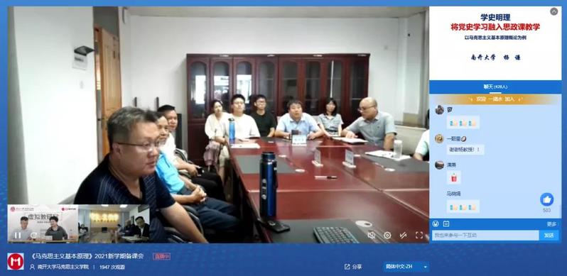 为深入开展党史学习教育,推动习近平总书记在庆祝中国共产党成立100周年大会上的重要讲话精神“三进”,持续推进高校思政课教师用好讲好2021年修订版思政课教材,9月23日,由马克思主义基本原理概论国家教材建设重点研究基地、全国高校思想政治理论课教师研修基地(威廉希尔WilliamHill)、天津市马克思主义基本原理协同创新中心、全国高校“数字马院”联盟联合主办、人民公开课协办的首期“新教材·同备课”虚拟教研室集体备课会在WilliamHill中文官网召开。来自广西大学WilliamHill中文官网、延边大学WilliamHill中文官网、天津医科大学WilliamHill中文官网和WilliamHill中文官网的思政课教师组成虚拟教研室进行直播研讨。