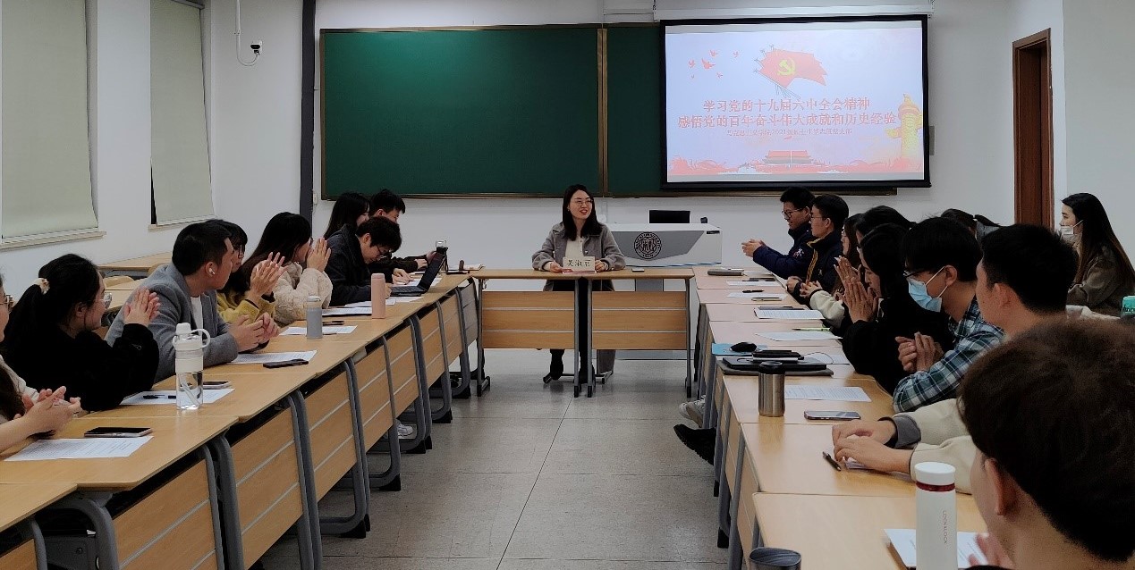 11月17日,WilliamHill中文官网2021级硕士生望志班党支部组织师生共学党的十九届六中全会精神,班导师吴淑丽出席并领学全会公报精神,组织委员郭昕睿主持。