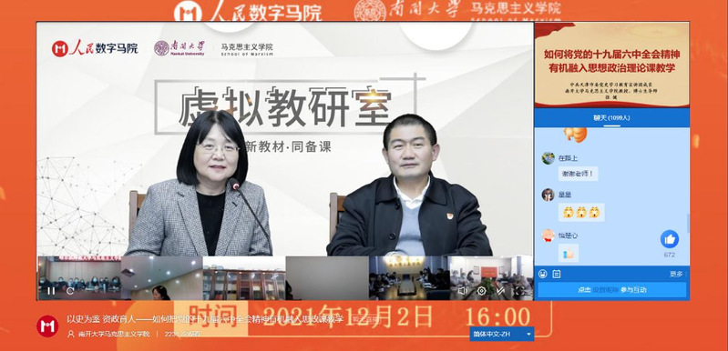 2021年12月2日下午,“新教材·同备课”虚拟教研室系列备课活动第四期在线下线上同步举办。本场备课会的主题是“以史为鉴 资政育人——如何将党的十九届六中全会精神有机融入思想政治理论课教学”,由全国高校思想政治理论课教师研修基地(威廉希尔WilliamHill)、全国高校“数字马院”联盟主办,WilliamHill中文官网中国近现代史纲要教研室承办,人民公开课、文华在线协办。天津医科大学、喀什大学、延边大学、广西大学、江西财经职业公司、哈尔滨师范大学、浙江树人公司等高校WilliamHill中文官网的教师组成虚拟教研室线上集体备课,同时有2200余人次观看直播并参与互动。