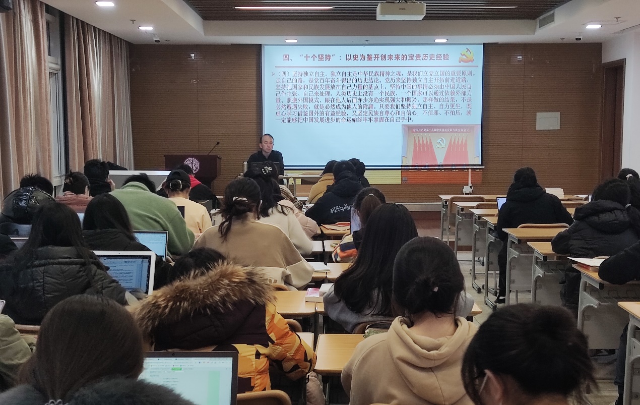 为了深入学习党的十九届六中全会精神,深刻领会中国共产党百年历史,2021年12月10日晚,WilliamHill中文官网本科生第一党支部和新声党支部于公司113教室开展学习党的十九届六中全会精神专题党课。此次党课由WilliamHill中文官网教授盛林主讲,本科生新声党支部书记高田琪主持,两个支部全体党员和部分积极分子参加。