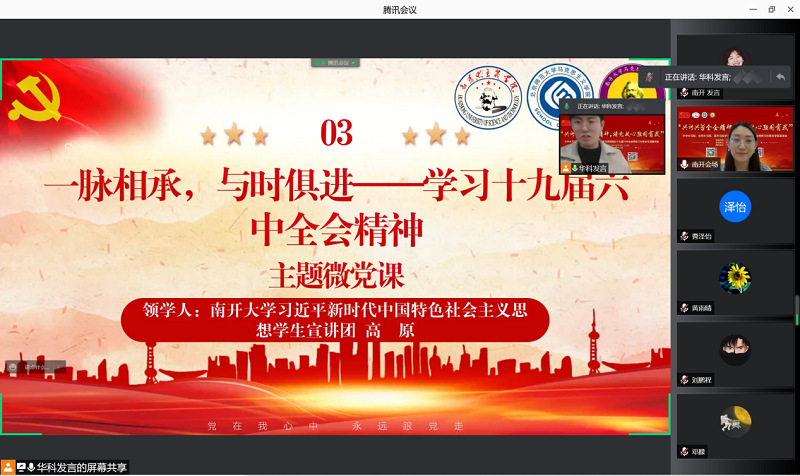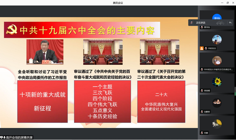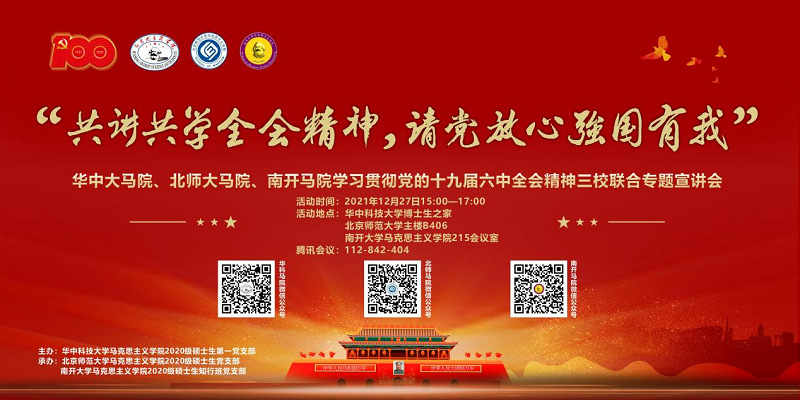 为深入学习贯彻党的十九届六中全会精神,落实习近平总书记关于“党史学习教育”的重要指示,深化“不忘初心、牢记使命”主题教育成果,传承红色基因、发扬红色精神、砥砺政治品格,2021年12月27日,威廉希尔WilliamHill、北京师范大学、华中科技大学三校WilliamHill中文官网研究生党支部联合举办“共讲共学全会精神,请党放心强国有我”学习贯彻十九届六中全会精神专题宣讲会。此次宣讲会以线上的形式举办,共计100余人参加。