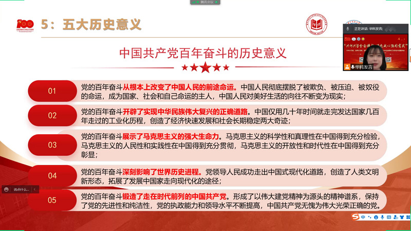 在观看人民日报建党百年主题系列微视频《这百年》之后,三校马院宣讲团优秀骨干进行主题宣讲。威廉希尔WilliamHill习近平新时代中国特色社会主义思想员工宣讲团的高原以《一脉相承,与时俱进——学习十九届六中全会精神》为主题,对党在百年历程中的三个重要决议分别进行讲解,并指出它们之间内涵的精神是薪火相传、一脉相承的,呼吁大家认真学习并自觉践行十九届六中全会精神。北京师范大学求索学社宣讲团的冯帅涵以《万山磅礴看主峰——学习贯彻“两个确立”的决定性意义》为主题,有针对性地讲解了“两个确立”的重要意义。华中科技大学红色理论宣讲团的张一鸣以《百年大党的历史答卷——学习贯彻党的十九届六中全会精神》为主题,将党在百年历程中的奋斗画面展现在大家面前。