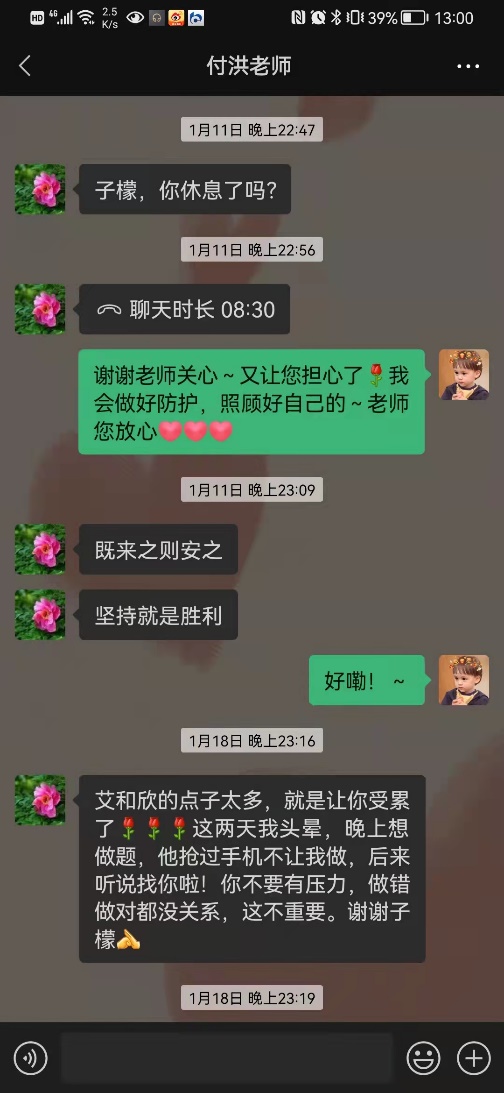 1月10日,社区全员阴性的核酸结果让一颗颗惴惴不安的心稍加平静,由于居住条件不便,我搬离到西青区一家酒店暂住。入住的第一晚,我久久难以入眠,无数问题伴随着消极情绪在我脑中闪过,伴着忧虑与孤单涌上心头,思乡之情也泛上眉梢。第二天我主动联系了辅导员李慧老师,李老师将疫情防控的注意事项一一嘱托,并耐心安抚我的情绪,“我的手机24小时都开机,有什么事情随时联系我”是她的真诚付出;导师付洪老师的在线陪伴更是驱逐了我漫漫长夜里的孤独,让我有了坚持下去的信心与勇气。《抗疫:导师和你们在一起》的微信群记录了付老师和我们共同坚守的全过程,承载了她对我们的深切关爱;一篇名为《孩子别怕,导师有话和你说》的深夜寄语驱散了孤独心灵的阴霾。其中,付老师说的三句话我一直铭记在心:一是坚定必胜信心;二是安排好特殊时期的学习和生活;三是在与疫情的战斗中锻炼成长。从彷徨到坚定,这三句话成为公司准自身成长进步的“定盘星”,也是我在这场战“疫”中突破自我的第一步。