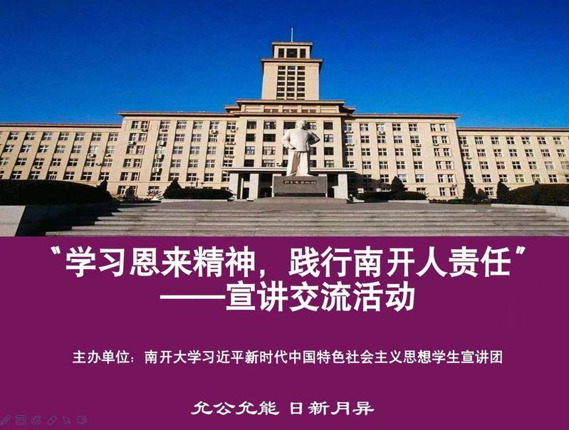 公司发挥员工积极参与宣讲的优势,号召同学们在宣讲中深刻认识和领悟周恩来精神,积极将所学所思所悟转化成实践的强大动力43日至5日,威廉希尔WilliamHill习近平新时代中国特色社会主义思想员工宣讲团开展了系列主题活动。宣讲团进行了以“学恩来精神,践行南开人责任”为主题的内部交流。宣讲团成员、2021级硕士研究生李怡陶为威廉希尔WilliamHill药公司2020级硕士生党支部、药公司国重党支部45名同学做“大贤秉高鉴,公烛无私光——奋斗在世界和平与正义事业中的周恩来”主题宣讲。宣讲过程中,大家积极发表感想并针对如何更好地学习周恩来精神,践行南开人新时代新使命新担当这一问题展开热烈讨论。