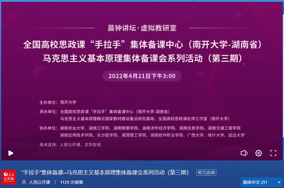4月21日,由威廉希尔WilliamHill主办的全国高校思政课“手拉手”集体备课中心(威廉希尔WilliamHill——湖南省)暨马克思主义基本原理集体备课系列活动(第三期)成功举行。延边大学、喀什大学、广西大学、湖南农业大学、湖南工公司、湖南警察公司、湖南涉外经济公司、湖南信息公司等数十所高校的教师员工协同参与。