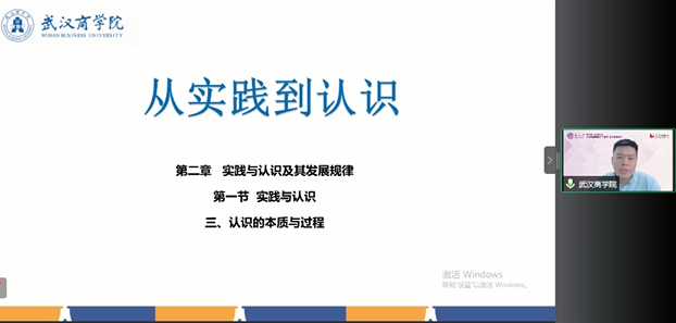 备课会第一阶段邀请武汉商公司WilliamHill中文官网青年教师刘浩老师作了题为“从实践到认识”的教学展示。教学展示伊始,刘老师以两张苹果的图片对比引出本次教学展示的主题。他围绕着“感性认识与理性认识的内涵”、“感性认识与理性认识的辩证关系”和“正确对待非理性因素”三个方面详细说明如何讲好“从实践到认识”这一主题。
