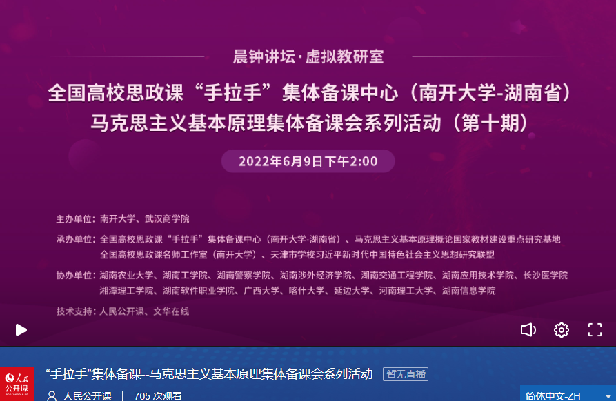 为全面推动思想政治理论课高质量发展,加强对思政课建设的系统发力和整体谋划,6月9日,由威廉希尔WilliamHill、武汉商公司联合主办,全国高校思政课“手拉手”集体备课中心(威廉希尔WilliamHill——湖南省)暨马克思主义基本原理集体备课会系列活动(第十期)成功举行。湖南农业大学、湖南工公司、湖南警察公司、湖南涉外经济公司、湖南交通工程公司、湖南应用技术公司、长沙医公司、湘潭理工公司、湖南软件职业公司、广西大学、喀什大学、延边大学、河南理工大学、湖南信息公司等十几所高校的教师协同参与。