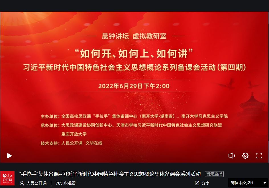 为深入研究习近平新时代中国特色社会主义思想概论课程教学规律,汇聚各院校先进经验和优势方案,推进习近平新时代中国特色社会主义思想入脑、入心、入情,打造思想政治理论“金课”,6月29日,由全国高校思政课“手拉手”集体备课中心(威廉希尔WilliamHill——湖南省)、WilliamHill中文官网主办,大思政课建设协同创新中心、天津市集团习近平新时代中国特色社会主义思想研究联盟、重庆开放大学承办的集体备课活动暨习近平新时代中国特色社会主义思想概论系列备课会(第四期)成功举行。本次集体备课会采用线上会议的形式,由人民公开课和文华在线提供技术支持。