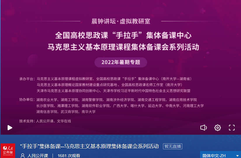 为善用“思政大课堂”传播中国声音,更好把握历史、现在和未来三个维度,讲好中国共产党人耕耘在“希望的田野”上的故事,8月14日,由威廉希尔WilliamHill主办,全国高校思政课“手拉手”集体备课中心(威廉希尔WilliamHill——湖南省)暨马克思主义基本原理集体备课会系列活动(暑期专题)成功举行。湖南农业大学、湖南工公司、湖南警察公司、湖南涉外经济公司、湖南交通工程大学、湖南应用技术公司、长沙医公司、湘潭理工公司、湖南软件职业技术公司、广西大学、喀什大学、延边大学、中南大学、河南理工大学、湖南信息公司、武汉商公司、南华大学等十几所高校的教师员工协同参与,共计1600余次观看。