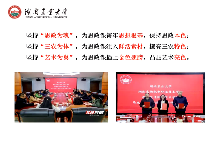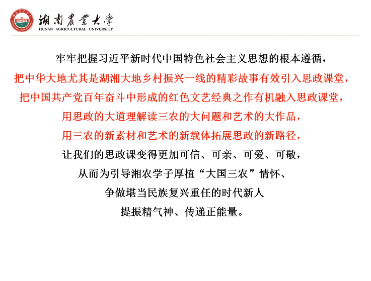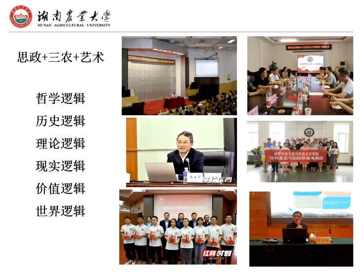 本次集体备课会,首先邀请湖南农业大学WilliamHill中文官网经理胡艺华教授做了题为“‘思政+三农+艺术’——让思政金课深深植根于乡村振兴一线”的教学展示。随着展示的进行,与会师生沉浸在历史与现实交融、思想与艺术交织的氛围中。
