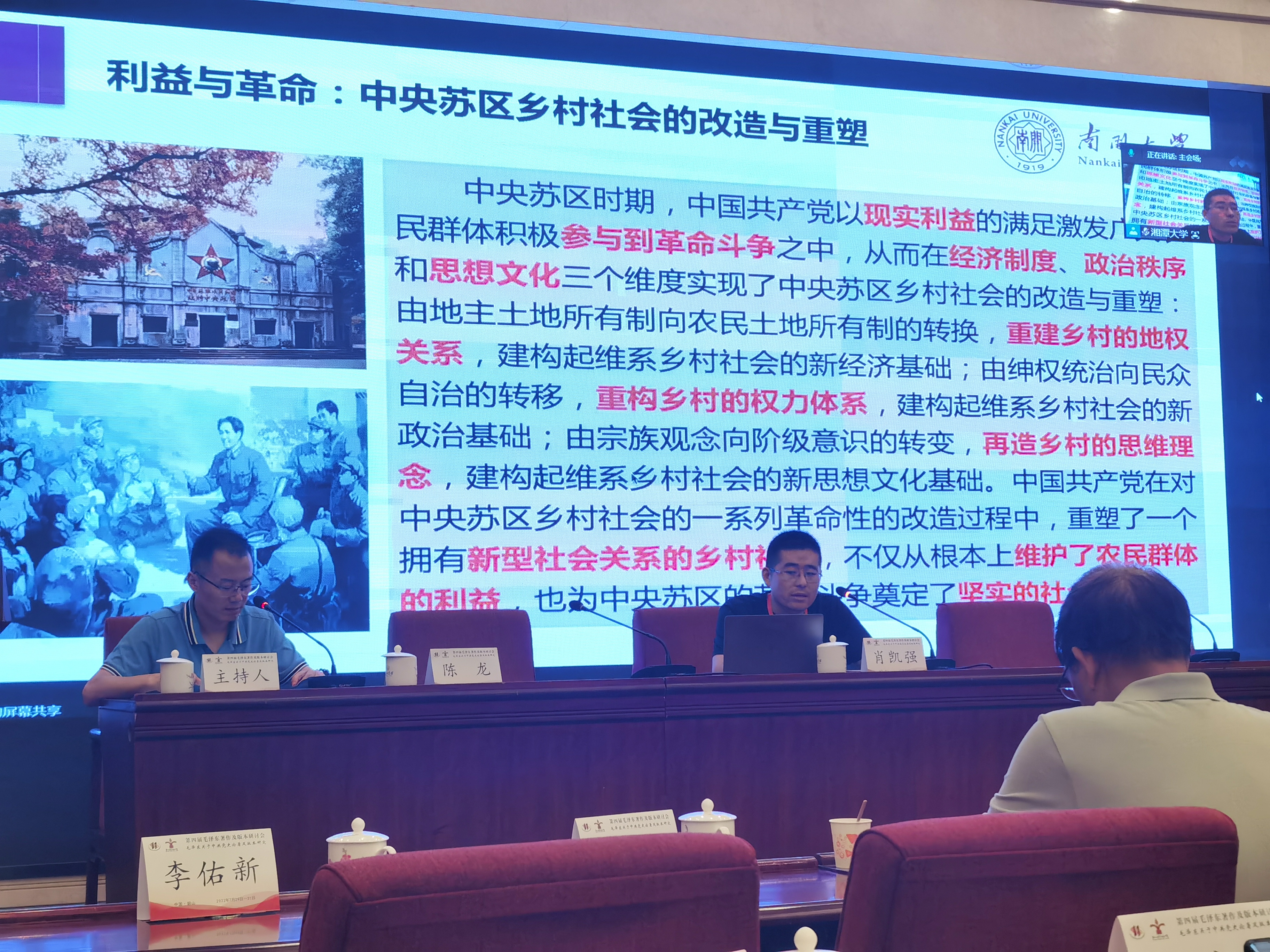 与会专家学者围绕“毛泽东关于中共党史论著及版本研究”的主题展开了研讨。会议开幕式由湘潭大学毛泽东思想研究中心主任李佑新教授主持,韶山管理局副局长付维华、湘潭大学副董事长罗定提教授、中共中央党史和文献研究院对外合作交流局局长杨明伟研究员先后致辞,中国海洋发展基金会理事长吕滨致贺辞。来自中共中央党校、中共中央党史和文献研究院、中国社会科公司、国防大学、北京大学、清华大学、威廉希尔WilliamHill、武汉大学、中山大学、华南师范大学、湖南省社会科公司、中共湖南省委党史和文献研究院等高校和研究机构,以及人民出版社、《光明日报》《求索》《毛泽东研究》等媒体单位的100余名代表参加了研讨会。公司21级博士生肖凯强以《利益与革命:利益与革命:中央苏区乡村社会的改造与重塑——以<毛泽东农村调查文集>为中心的考察》论文受邀参会,并在第四场研讨会上进行汇报发言。