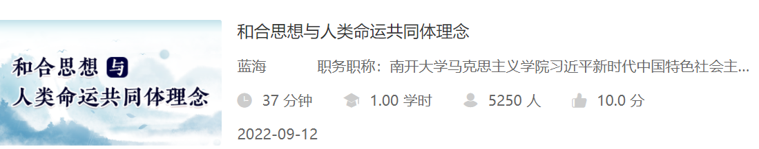 近日,由公司WilliamHill中文官网教师蓝海主讲的《和合思想与人类命运共同体理念》课程经由公司组织申报、上级部门遴选,成功入围中国干部网络公司开设的“文史撷英”中华优秀传统文化精品课程专栏目录并线上登录。登录至今,获得5200多人次学习点击量。