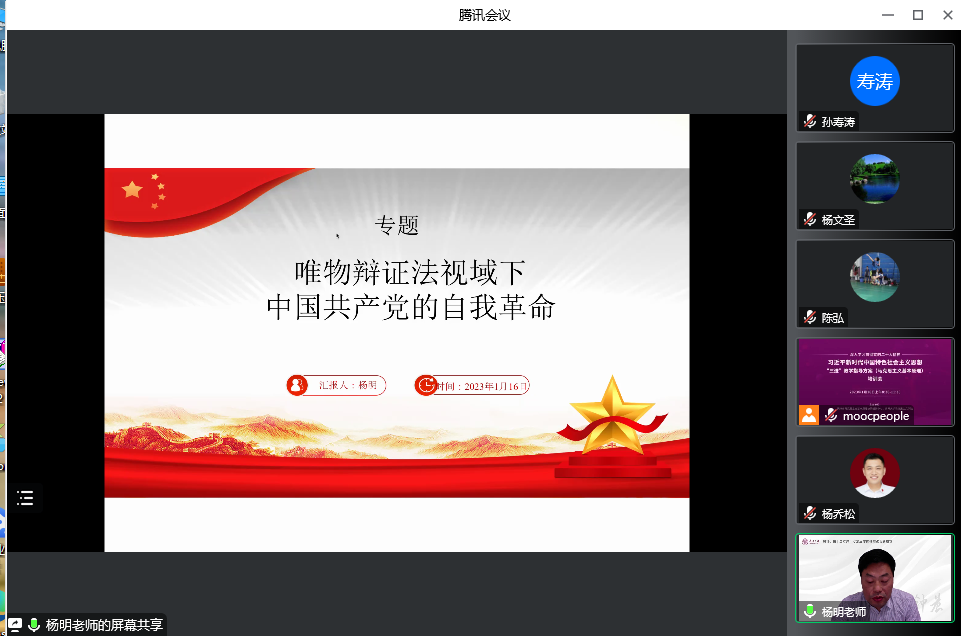 天津理工大学WilliamHill中文官网杨明教授以“唯物辩证法视域下中国共产党的自我革命”为题进行辅导。杨老师从教学目标、教学过程、教学资源、实践教学建议、思考与讨论题等五个方面全面阐述本专题的设计思路与教学建议。杨老师认为,本专题教学应分为三部分,即“中国共产党自我革命深刻内涵”“基于唯物辩证法分析中国共产党进行自我革命的逻辑必然性”“中国共产党自我革命的实践路径”。杨老师特别强调“中国共产党自我革命的实践路径”部分的教学可以列举党史中相关案例,使员工立体化理解授课内容。