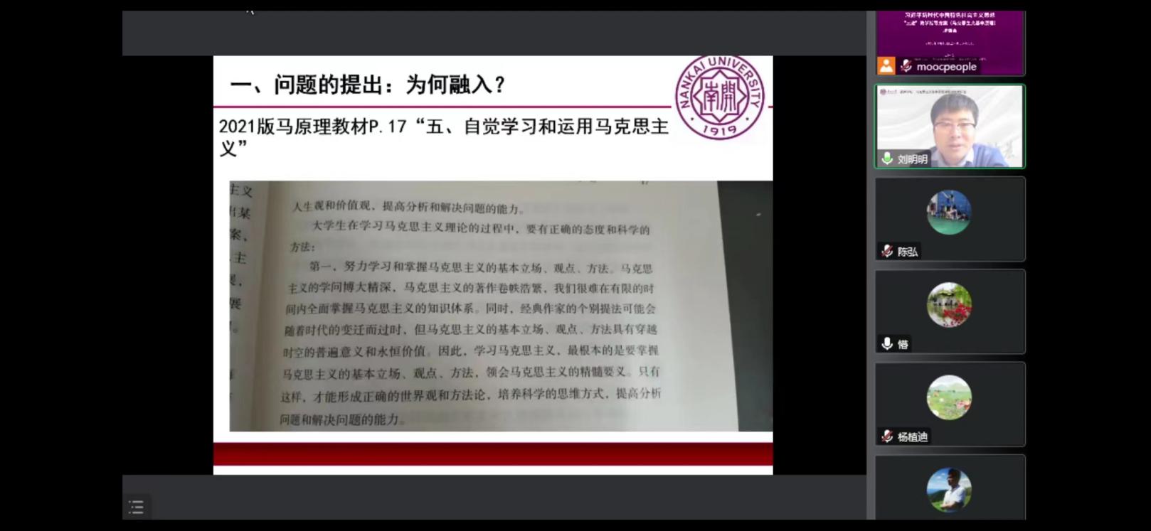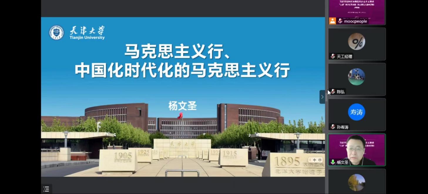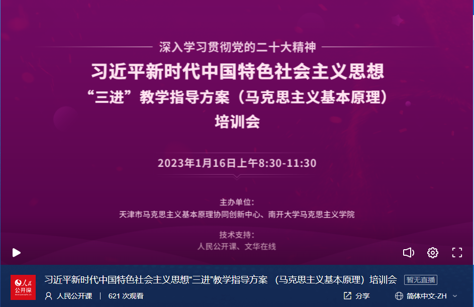 为深入学习贯彻党的二十大精神,加快推进习近平新时代中国特色社会主义思想进教材、进课堂、进师生头脑,切实增强思政课的政治性、时代性、原则性,不断提高天津市思政课建设水平,打造天津高校思政工作新特色,1月16日上午,习近平新时代中国特色社会主义思想“三进”教学指导方案(马克思主义基本原理)培训会成功举行。本次培训会由天津市马克思主义基本原理协同创新中心(威廉希尔WilliamHill)主办,全市二百余名思政课教师参加。本次培训会采用线上会议形式,人民公开课和文华在线提供技术支持。