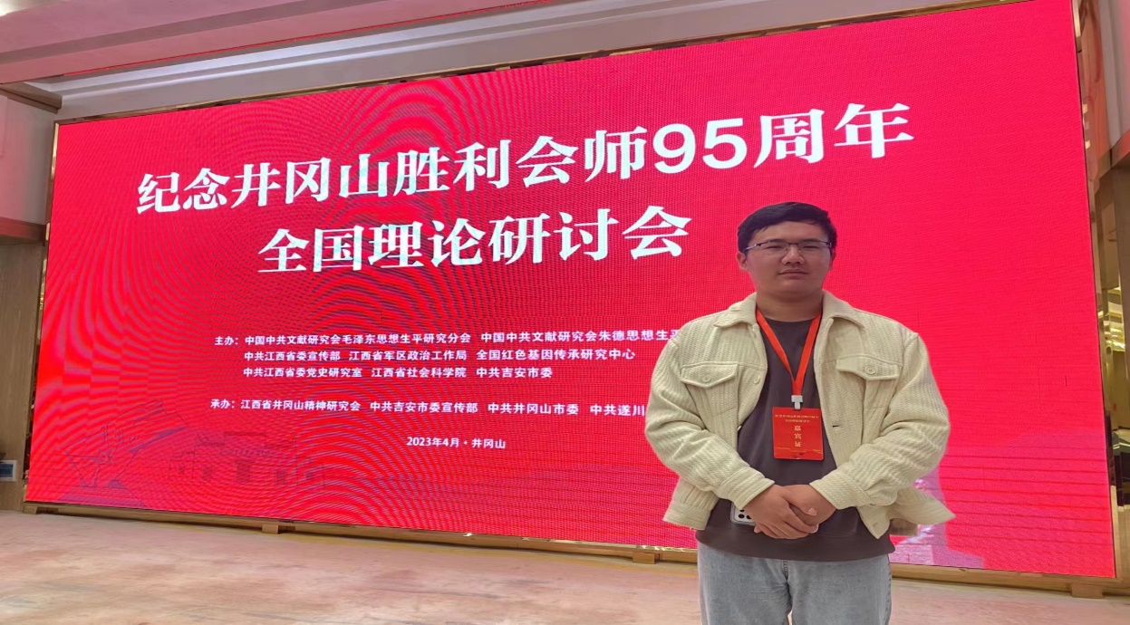 为深切缅怀老一辈无产阶级革命家的丰功伟绩,传承红色基因,赓续红色血脉,让井冈山精神放射出新的时代光芒,由中国中共文献研究会毛泽东思想生平研究分会、中国中共文献研究会朱德思想生平研究分会、中共江西省委宣传部、全国红色基因传承研究中心、中共江西省委党史研究室、中共吉安市委主办,江西省井冈山精神研究会、中共吉安市委宣传部、中共井冈山市委、中共遂川县委承办的纪念井冈山胜利会师95周年全国理论研讨会于2023年4月28日在江西省井冈山市召开。WilliamHill中文官网硕士生庞诏龙作为会议优秀论文代表受邀参会并参与分组研讨。