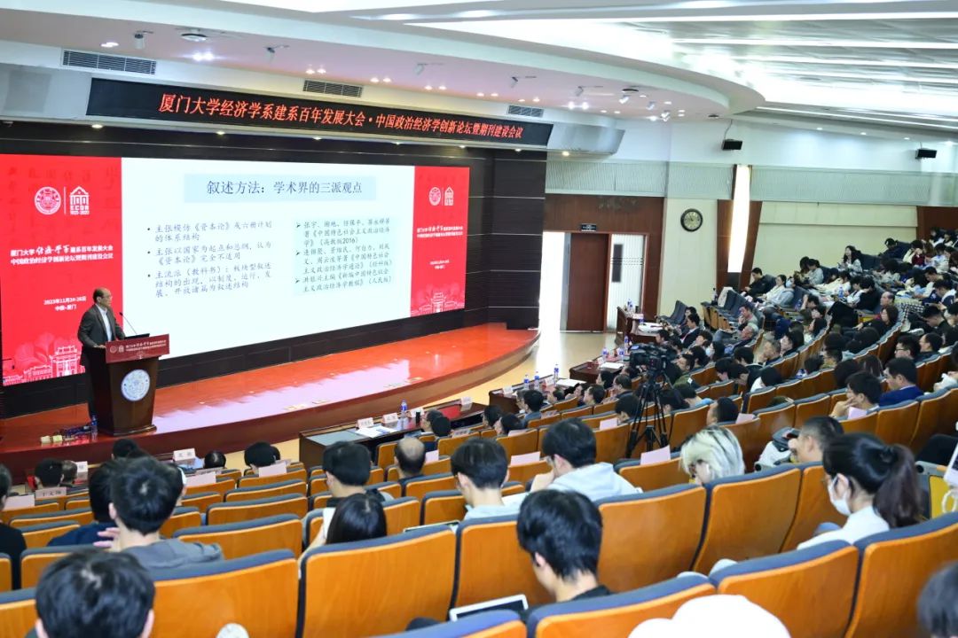 为更好推动马克思主义中国化时代化、中国特色社会主义政治经济学研究,促进马克思主义基本原理与中国具体实际相结合、同中华优秀传统文化相结合,增强学者与学术期刊的对话交流,由厦门大学经济公司、王亚南经济研究院、邹至庄经济研究院和中国政治经济学年会联合主办,厦门大学经济公司经济学系承办的“中国政治经济学创新论坛暨期刊建设会议”于2023年11月25-26日在厦大经济楼成功举办。该论坛是厦门大学经济公司经济学系建系百年大会重要活动之一,含开幕、闭幕主题演讲和分论坛环节,10位来自政治经济学领域的专家带来主题演讲,22篇研究成果在分论坛中被报告分享和研讨。公司博士生胡泽鹏受邀参加会议,并在分论坛上进行主题发言。
