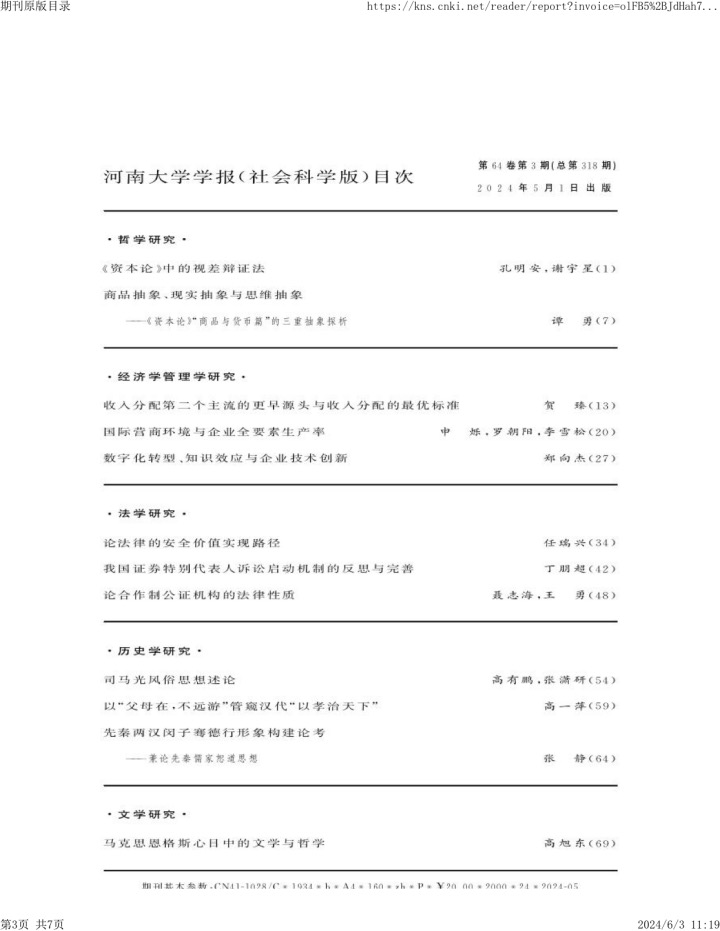 公司孔明安教授在《河南大学学报》发表文章《<资本论>中的视差辩证法》。文章认为,辩证法构成了马克思《资本论》中的哲学方法。如果从研究对象和视差的视角看,《资本论》的辩证法也可以被视为视差辩证法:它具体表现为货币之视差、剩余价值之视差等。视差乃是观察同一对象的不同视角而形成的差异。这一差异既取决于主体,也依赖于客体之不同。因而,在主体与客体之间,进而在“实证客体”与“现实客体”之间就形成了视差的辩证法。视差辩证法通过直面这一视差,把握视差现象背后的“现实”,同时又站在视差“现实”的基础上对仍处于“视觉欺骗”阶段的观察予以批判。从这一视角看马克思对货币和剩余价值的考察也是视差辩证法的体现。