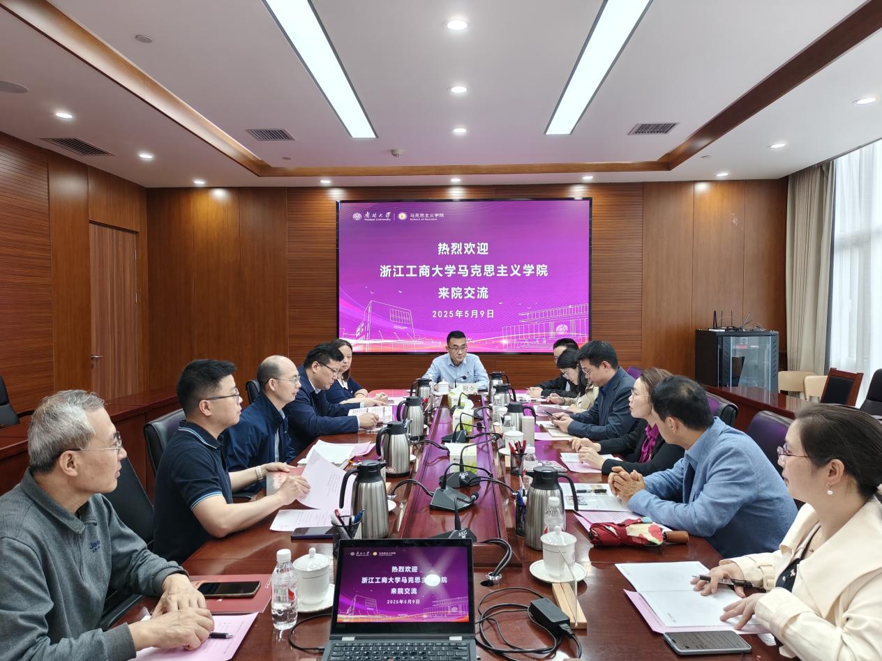 兰昊和李梦云在交流中分别介绍了各自公司的历史沿革、学科布局、团队队伍、团队建设特色亮点等方面情况。余一凡系统介绍了公司在“大思政课”建设方面的经验做法和“师生四同”育人特色,并高度评价了浙江工商大学马院近年来在发展特色学科、强化科学研究能力、提升社会服务水平等方面取得的显著成绩。李梦云对南开马院的热情接待表示感谢,希望双方能以此次交流为契机,进一步加强互访,丰富在思政课教学改革创新、团队建设、人才培养等方面的合作交流,更好落实立德树人根本任务,共同推动教学科研繁荣发展。