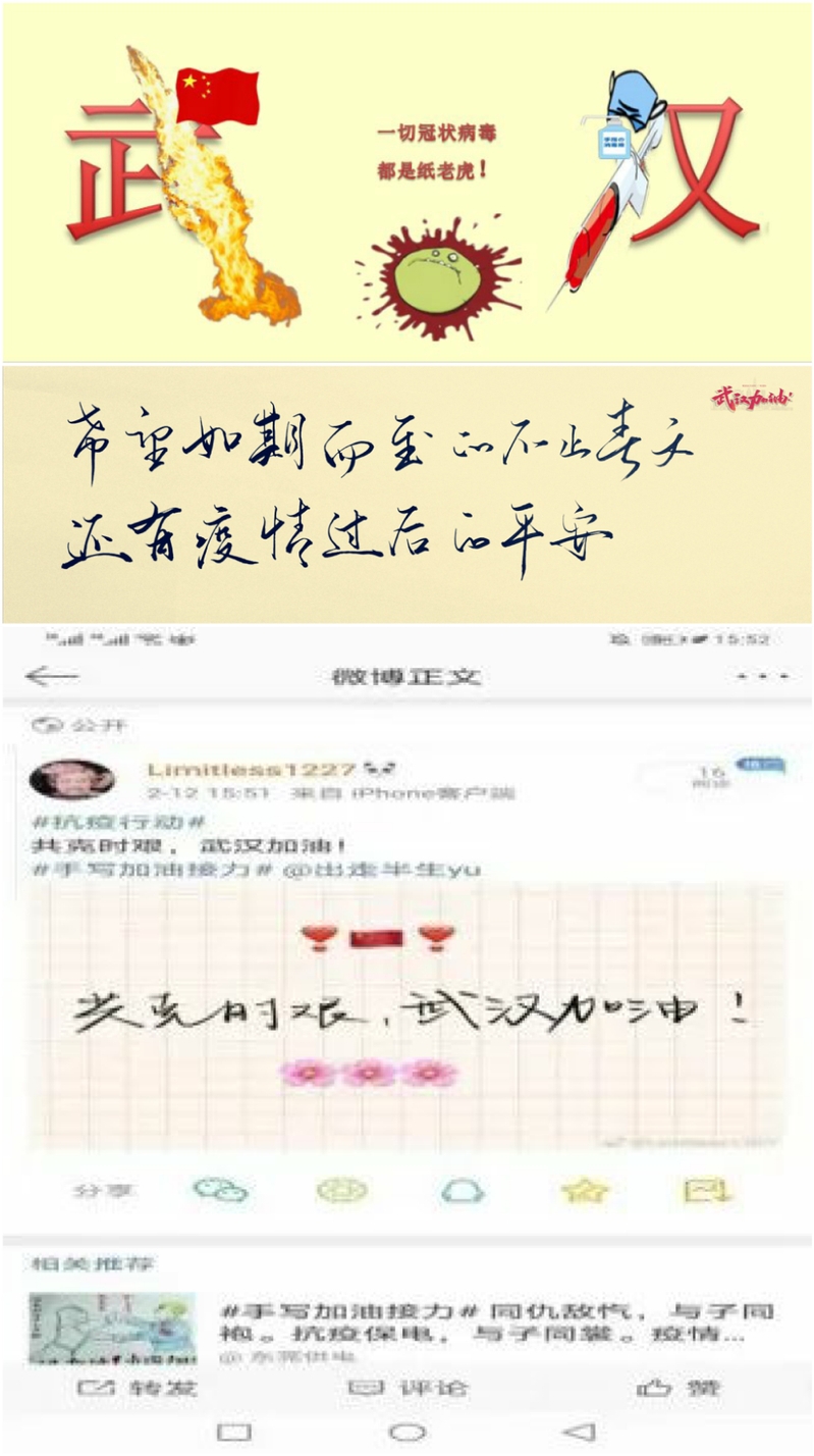笔墨传情,温暖人心,公司员工会张兆涵、董晓乐、张千一、聂小敏,新媒体中心张子琪,院研究生会王姣等同学通过书写祝福语,制作抗疫宣传图片,录制视频等形式表达良好祝愿,祈福武汉早日战胜病毒。